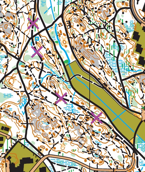 Huom. Varsinkin maaston eteläosissa liikkuu hevosia, joita on syytä varoa. Karttaan kielletyksi merkityillä ratsastusteillä ei saa kulkea (ks. kuva). Ne voi kuitenkin ylittää siten, ettei mene liian läheltä hevosia.