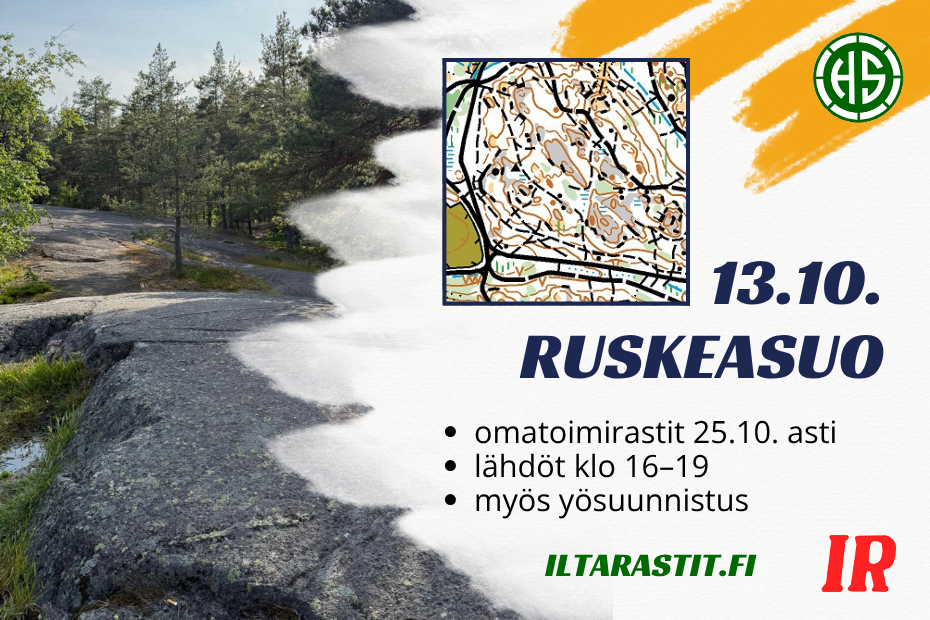 Iltarastit suunnistetaan vielä kerran maanantai-iltana 13. lokakuuta Ruskeasuolla (jo saman viikon lopussa siirrytään sunnuntaiaamupäivän tapahtumiin). Ratamestarina toimii Tuomas Heikkilä: