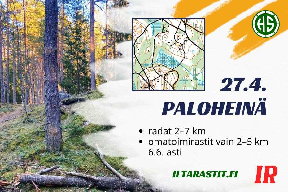Maanantaina 27. huhtikuuta Iltarastit järjestetään Paloheinässä. Metsään voi lähteä klo 16.30–19, ja maali sulkeutuu klo 20. Ilmoittautua ja maksaa voi joko etukäteen Rastilipussa tai tapahtumapaikalla.