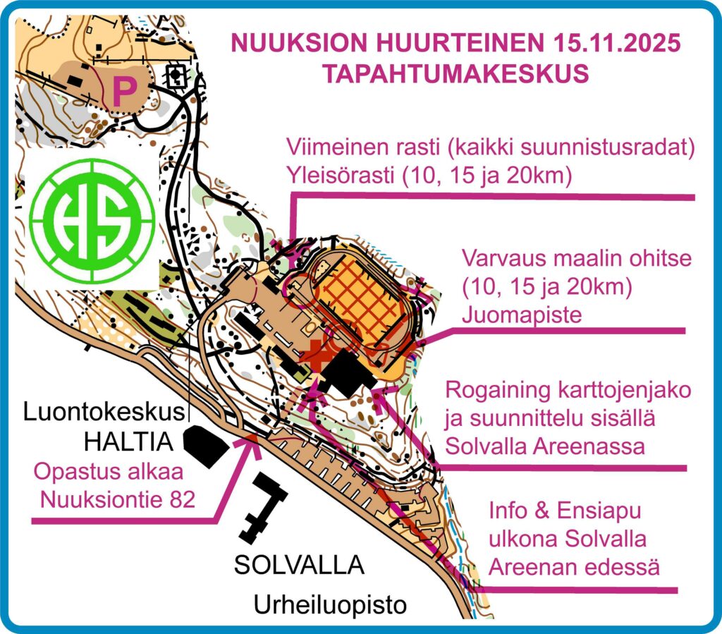 Huolto: Sisätila rogaining suunnitteluun (Solvallan areenan iso sisäkenttä, ei pöytiä/tuoleja). Mahdollisuus varusteiden vaihtoon sisätiloissa, rajoitetusti pesutilaa. Varusteiden säilytys omalla vastuulla suorituksen ajaksi sisätiloissa. Ei jalkineet jalassa sisälle.