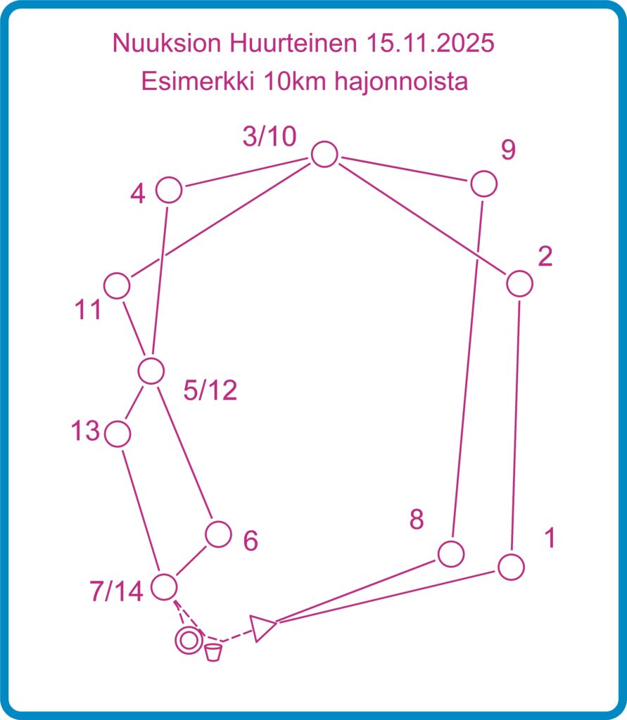 - 10 km radalla on hajonta – yhden miehen viesti (kts esimerkkikuva). Hajontaparit eivät ole keskenään yhtä pitkiä, mutta lopulta kaikki kulkevat kuitenkin samat rastivälit ja yhtä pitkän matkan. Muista leimata kaikilla rasteilla jokaisella kerralla.